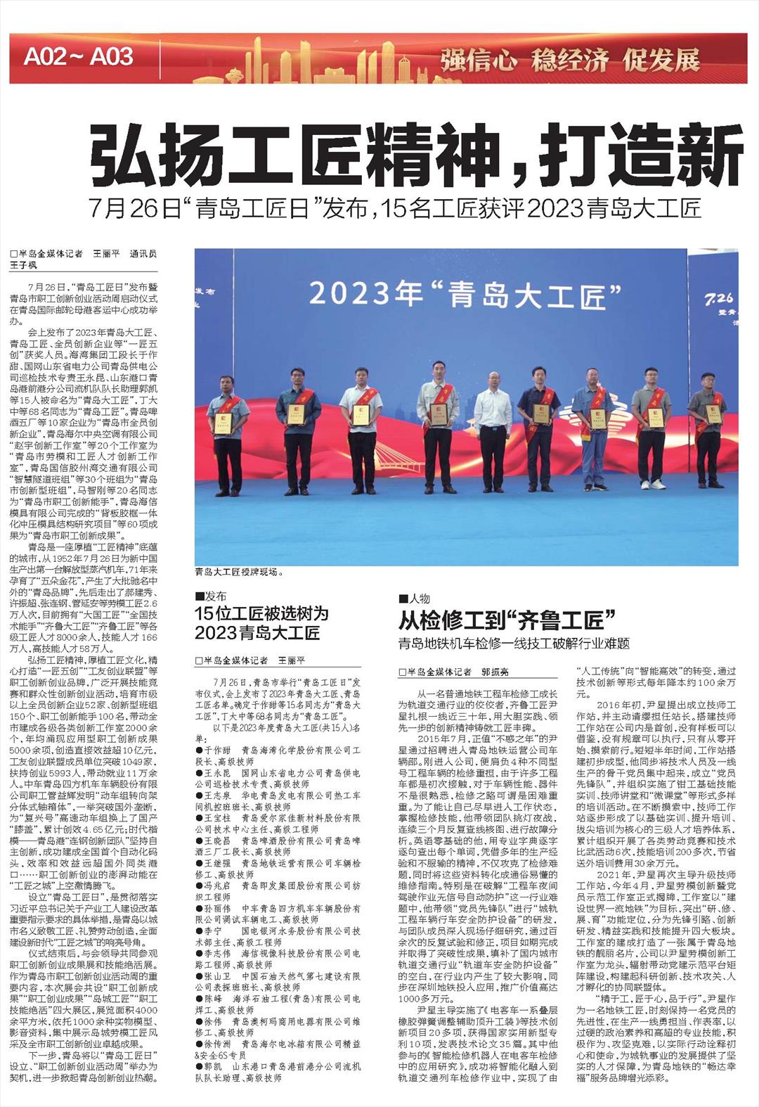15位工匠被选树为2023青岛大工匠