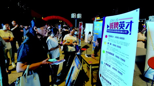 “白天还是挺热的,晚上凉快了,正好过来看看。”招聘会现场,今年毕业的大学生小张拿着手机,拍着自己心仪的岗位,时不时与招聘企业进行着沟通,“早就在手机上看到这次招聘会,岗位挺多的,投了近10份简历,有几个正在比较,看看哪个更适合我。”看着手里还剩下几份简历,看来小张是有备而来。