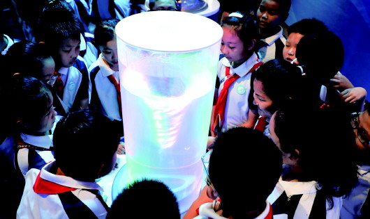 开馆当天,前来参观的孩子们一起观看科学小实验。